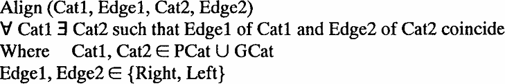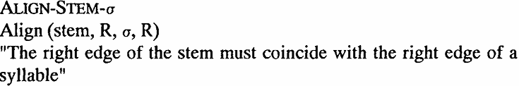 Let us therefore turn to alignment constraints, which regulate the adjacency or coincidence of linguistic objects. Alignment constraints are frequently used to analyze the metrical behavior of words. The general format of alignment constraints is given in (8), with a perhaps more accessible formulation in (9) (see McCarthy and Prince 1993a):