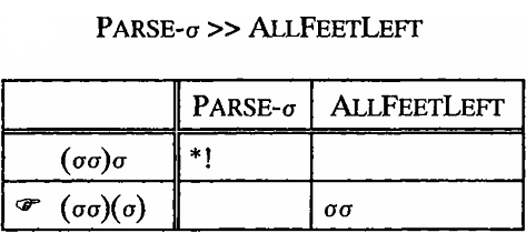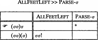 The tableaux show that unparsed syllables are only allowed if PARSE-σ is ranked below ALLFEETLEFT. Under such a ranking PARSE-σ needs to be violated in order to satisfy the more important ALLFEETLEFT.