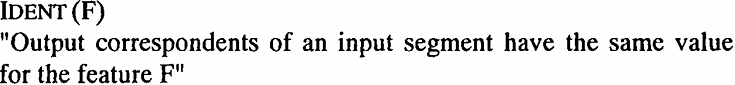 Featural identity between input and output is achieved by parametrized constraints of the family IDENT (F), where F stands for a distinctive feature:
