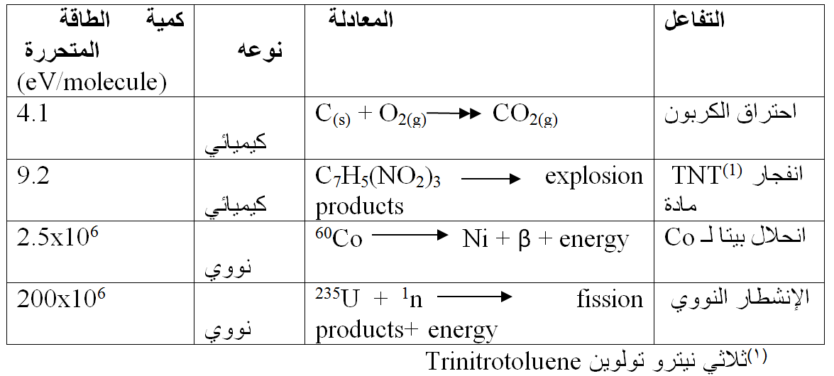 جدول (1): مقارنة بين كمية الطاقة المتحررة من التفاعلات النووية والتفاعلات الكيميائية.