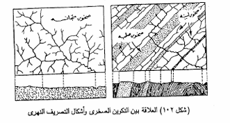 يعتبر الشكل العام الذي تظهر به مجموعة المجاري النهرية المختلفة في إقليم ما ، النتيجة الأساسية الهامة التى تربط بين خصائص التكوين الصخري ونظام بنائه من جهة، وبين مناخ الإقليم والتطور الجيومورفولوجي للمجاري النهرية ، في هذا الإقليم من جهة أخرى ، وكما أن كثافة التصريف النهري تختلف في المناطق الرطبة الغزيرة الأمطار عن تلك في المناطق الجافة القليلة الأمطار، إلا أن للتكوين الصخرى أهمية بالغة في تشكيل أنماط التصريف النهري المختلفة ، إذ تتوقف هذه الأشكال على مدى نفاذية الصخور للمياء من جهة ومدى تجانسها من جهة أخرى ، ففي المناطق التي تتميز بتجانس تكوينها الصخرى سواء أكانت تتكون من صخور طينية متجانسة Homogenous caly أو من أخرى نارية متجانسة ، تساعد على تكوين تصريف نهرى أشبه بشكل أفرع الشجرة ، بينما يتميز التصريف النهري فوق المناطق التي تتألف من صخور صلبة متعاقبة فوق صخور لينة من أنهار تشق مجاريها في مناطق الضعف الجيولوجي ، ومن ثم يظهر التصريف النهرى على شكل أنهار متشابكة تعكس أثر اختلاف التكوين وقد اهتم الأستاذ زرنيتز Zenit في كتاباته منذ عام 1932 بدراسة العلاقة المتبادلة بين أشكال التصريف النهري ، والتكوين الجيولوجي الذي تتكون فوقه ، وتتخلص أهم العوامل التي تؤثر في أشكال التصريف النهري فيما يلي :