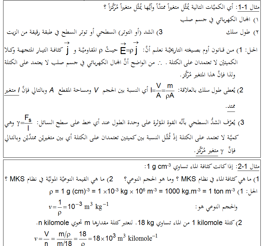 أمَّا المتغيرات المستقلة عن الكتلة كالحرارة والضغط والكثافة فتُدعى المتغيرات المُركَّزة[2]. تُسمَّى النسبة بين المتغير وكتلة النظام القيمة النوعيَّة specific value لهذا المتغير ونقول عنها أحياناً بأنَّها القيمة لوحدة الكتلة[3]. وأفضل مثال هو الحجم النوعي [4] v= V/m والذي هو عكس الكثافة. من الواضح أنَّ القيمة النوعيَّة لمتغير ما عبارة عن متغير مركَّز. ونستخدم أيضاً القيمة النوعيَّة الموليَّة molal specific value والتي هي النسبة بين المتغير وعدد المولات في النظام. نُذكِّر بأنَّ المول mole وحدة ابتدعها الكيميائيون لتُمثِّلَ عدد أفوجادرو في وزن نوعي لعنصرٍ ما. فمول واحد من الأكسجين يعني 32g من غاز الأكسجين ويحوي عدد أفوجادرو NA=6.023 X 1023 من جزيئات الأكسجين. في كثير من الأحيان يُفضَّل التعامل مع القيم النوعيَّة لمتغيرات نظامٍ ما، إذْ أنَّه من السهل التعامل مع المعادلات المستقِّلة عن الكتلة. سوف نرى لاحقاً أنَّ التعبير عن حالة نظامٍ ما يبدو منطقياً إذا استخدمنا زوجاً (أو أكثر) من المتغيرات: أحدُها ممتد والثاني مركَّز. نُلخِّص في الجدول 1-1 التالي بعض المتغيرات الممتدَّة والمُركَّزة لبعض الأنظمة.