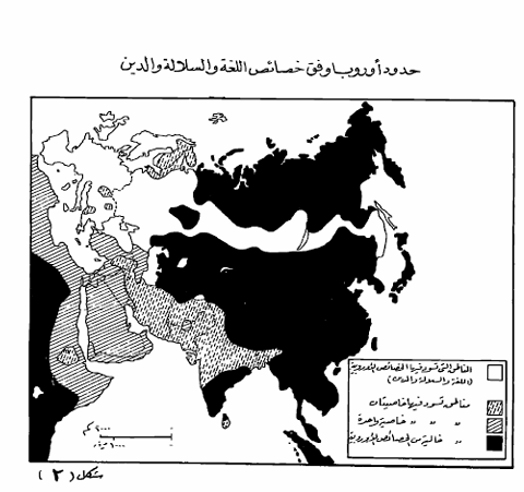 وأينما وجدت هذه الصفات الثلاثة مجتمعة في نصف الكرة الشرق فالنتيجة هي أوروبا، وخلف الصحراء الكبرى تسود السلالة الزنجية والأديان القبلية (الأرواحية) أو الإسلام واللغات التي تنتمى إلى المجموعة البالتوية وحتى دول شمال أفريقيا التي تطل على السواحل الجنوبية للبحر الأبيض لا يمكن أن نطلق عليها صفة الأوربية ، رغم أن سكانها قوقازيون مثل سكان أوروبا وذلك لأن معظم السكان يدينون بالإسلام ويتكلمون لغات سامية وحامية. أما في جنوب وشرق أوراسيا فنجد مناطق حضارية أخرى ينتمى معظم سكانها إلى السلالة المغولية ويدينون بالبوذية والكنفوشية ويتكلمون لغات صينية وتبتية ، في حين أن شمال الهند وإيران وباكستان وأفغانستان يمكن أن نقول إنها تملك بعض السمات الأوربية ولو أنها تفتقر إلى ذلك العنصر الهام ألا وهو التراث المسيحي.