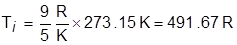 - عند نقطة الجليد Ti = 0 0C تكون درجة الحرارة بالفهرنهايْت هي tF = 491.67 - 459.67 = 32 0F