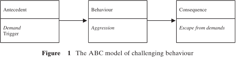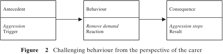 The demand ‘sets off’ aggression, which results in escape from the demand. From the perspective of the carer (Figure 2), the person’s aggression ‘sets off’ their removing the demand and the aggression stops (with some luck)!