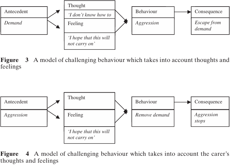 The carer may well have similar thoughts and feelings, s/he may be thinking (negatively) that sh/e does not know how to cope with the person’s behavior and s/he is almost certainly feeling distressed and frightened (see Figure 4).