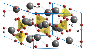 Figure 24.52 The structure of hydroxyapatite, Ca5(OH)(PO4)3, shown as Ca2ions coordinated by phosphate and OH ions into a strong three-dimensional structure. The separate O atoms are actually OH ions with the H lying outside the unit cell.