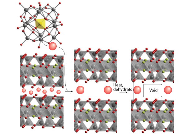 Figure 24.54 Schematic representation of pillaring of a clay by ion exchange of a simple monatomic interlayer cation with large polynuclear hydroxometallate followed by dehydration and cross-linking of the layers to form the cavities.
