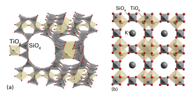 Na2Ti2O3SiO4.2H2O also has TiO6 octahedra, but in this structure these octahedra form clusters with four TiO6 units linked by the tetrahedral SiO4 units (as in Fig. 24.55a). This connectivity gives rise to large octagonal pores containing hydrated Naions. This compound, in common with several other titanosilicates such as K3H(TiO)4(SiO4)3·4H2O, a synthetic analogue of a natural mineral pharmacosiderite (Fig. 24.55b), shows excellent ion-exchange properties, particularly with large cations. These large ions replace Na+ with very high selectivity, so that, for example, Cs+ and Sr2+ ions may be extracted into the titanosilicate structure from their dilute solutions. This ability has led to the development of these materials for removal of radionuclides from nuclear waste, in which 137Cs and 90Sr are highly active.