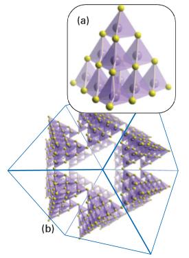 Figure 24.57 (a) An isolated supertetrahedral unit of stoichiometry Zn10S20 formed from individual ZnS4 tetrahedra. (b) These supertetrahedral units may be linked together asbuilding blocks to form large porous three-dimensional structures.