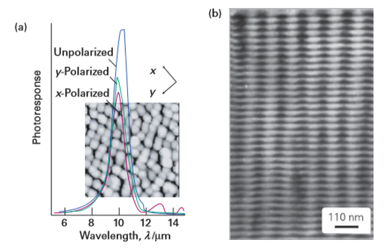 Figure 25.9 (a) Photoresponse (in arbitrary units) of (In0.2Ga0.8) As quantum dots formed using MBE. The IR absorption band arises from intraband absorption. The inset is an AFM image of the quantum dots. The quantum dots vary in lateral dimensions between 15 and 20 nm and in vertical height in the range 3–7 nm. (b) A crosssectional TEM micrograph of an ordered superlattice of (In0.2Ga0.8) As quantum dots in a GaAs matrix. (Courtesy of E. Towe.)