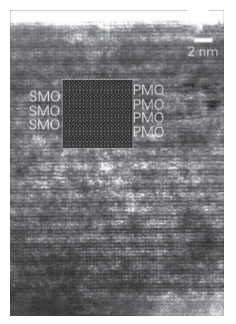 Figure 25.11 Cross-sectional TEM image of a 2 x 2 superlattice of SrMnO3 and PrMnO3 prepared using laser-MBE. The inset shows a calculated image confirming the (SrMnO3)2(PrMnO3)2 structure. (Reprinted with permission from B. Mercey, et al., In situ monitoring of the growth and characterization of (PrMnO3)n (SrMnO3)n superlattices. J. Appl. Phys., 2003, 94, 2716, American Institute of Physics.)