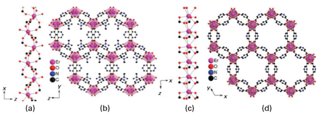 Fig 25.31 Views of the MOF structures of [Er2(PDC)3(DMF)2] ∞: (a) zigzag connection between adjacent erbium centres; (b) channels with a view along the orthorhombic x axis showing coordinated DMF molecules protruding into the channel space. Views of the structure after DMF solvent removal and rearrangement: (c) the shorter linear connection between adjacent Er3+ centres; (d) view of the open channels along the hexagonal z axis. (J. Jia, et al., Inorg. Chem., 2006, 45, 8838.) (Reproduced with permission from the American Chemical Society.) The interfaces fall into two main classes. Class I corresponds to hybrid materials where no covalent or ionic bonds are present between the organic and inorganic phases. In Class I materials, the various components interface through weak interactions such as hydrogen bonding, van der Waals contacts, and electrostatic forces. In Class II materials, at least some of the organic and inorganic components are linked through strong chemical bonds (covalent, ionic, or Lewis acid–base bonds). An important feature in the tailoring of hybrid networks is the chemical pathway used to design a given material. The main chemical routes are summarized in Fig. 25.32. It is possible to control the nature of the inorganic precursors (by using the methods described in Section 25.5), the nature of the organic material, and the method of assembling the composite material. The templated-growth fabrication processes often rely on organic molecules and macromolecules as structure-directing agents to achieve the construction of complex hierarchical architectures. It turns out that molecular and supramolecular interactions between template molecules (surfactants, amphiphilic block copolymers, organogelators, etc.) and hybrid or metal–oxo-based networks and NBBs allow a rich variety of nanocomposite materials to be prepared. Figure 25.33 illustrates two approaches to the assembly of NBBs into larger, ordered structures.