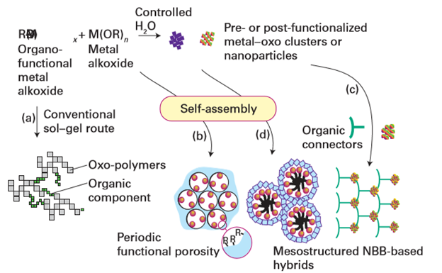 Figure 25.32 Different routes to obtain hybrid nanomaterials. Route (a) is a conventional sol–gel route that leads to ‘ordinary’ hybrids. Routes (b) and (d) involve the use of templates capable of self-assembly, giving rise to mesoorganized phases. Routes (c) and (d) involve the assembly of nanobuilding blocks (NBBs). (Adapted from C. Sanchez, et al., Chem. Mater., 2001, 13, 3061.)