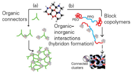 Figure 25.33 Different approaches to the assembly of nanobuilding blocks (NBBs) involving clusters and different connectors. (a) Ordered cluster dispersions based on the covalent linkage of complementary organic and inorganic NBBs. (b) Creation of a bicontinuous mesostructured hybrid arrangement. Interactions between the template and the inorganic NBB include covalent bonding and van der Waals forces (hydrophobic contacts). (Adapted from C. Sanchez, et al., Chem. Mater., 2001, 13, 3061.)