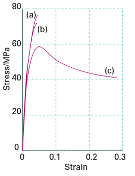 Figure 25.36 Typical stress–strain curves for (a) neat PMMA, (b) 2 per cent by mass as-received micrometre-sized alumina-filled PMMA composite, and (c) 2.2 per cent by mass 38 nm (MAA) alumina/PMMA nanocomposite. Although the strength decreases slightly for (c) (related to the decreased stress at the curve maximum), the overall ductility (related to the total strain) and toughness (related to the area under the curve) are greatly improved. (Adapted from B.J. Ash, et al., Macromolecules, 2004, 37, 1358.) (Reproduced with permission from the American Chemical Society.)
