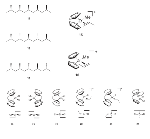 If we consider propene, we can see that the coordinated alkene induces less steric strain if its smaller CH2 end is pointing into the cleft of the (Cp)2 Zr catalyst (15), rather than the larger methyl substituted end, (16). The migrating polymer chain is thus adjacent to the methyl-substituted end of the propene molecule, and it is to this methyl-substituted C atom that the chain attaches, giving a head-to-tail sequence to the whole polymer chain. The second structural modification of polypropene is its tacticity, the relative orientations of neighbouring groups in the polymer. In a regular isotactic polypropene, all the methyl groups are on the same side of the polymer backbone (17). In regular syndiotactic polypropene, the orientation of the methyl groups alternates along the polymer chain (18). In an atactic polypropene, the orientation of neighbouring methyl groups is random (19). Control of the tacticity of a polymer is equivalent to controlling the stereospecificity of the reaction steps. The orientation of neighbouring groups is not simply of academic interest because the orientation has a significant effect on the properties of the bulk polymer. For example, the melting points of isotactic, syndiotactic, and atactic polypropene are 165ºC, 130ºC, and below 0ºC, respectively.