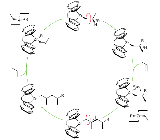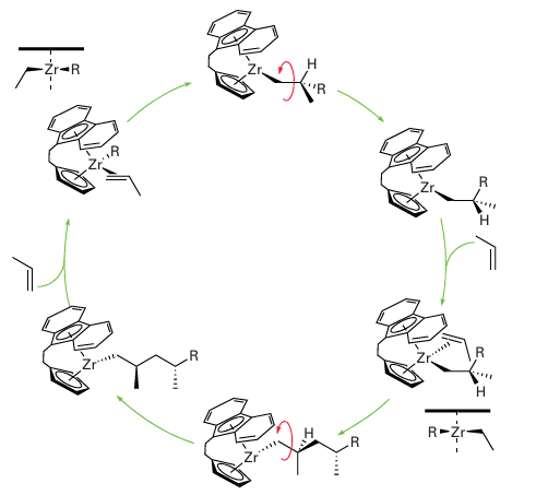 Figure 26.26 When propene is polymerized with an indenyl metallocene catalyst, isotactic polypropene results. The zirconium species all have a single positive charge; this has been omitted for clarity