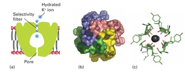 Figure 27.4 (a) Schematic structure of the K channel showing the different components and the transport of K ions: the blue halo represents hydration. (b) View of the enzyme from inside the cell showing the entrance pore that admits hydrated ions. (c) View looking up the selectivity filter showing how mobile dehydrated K ions are coordinated by peptide carbonyl-O atoms provided by each of the four subunits. Note the almost fourfold symmetry axis.