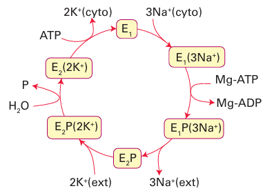 Figure 27.7 General principle of the Na, K-ATPase (the Na pump). Release of two K ions into the cytoplasm is accompanied by binding of ATP (from the cytoplasm) and conversion of the enzyme into state 1, which binds three Na ions from the cytoplasm. A phosphate group (P) is transferred to the enzyme, which opens to the external side, expels three Na ions, then binds two K ions. Release of the phosphate group causes release of K into the cytoplasm and the cycle begins again.