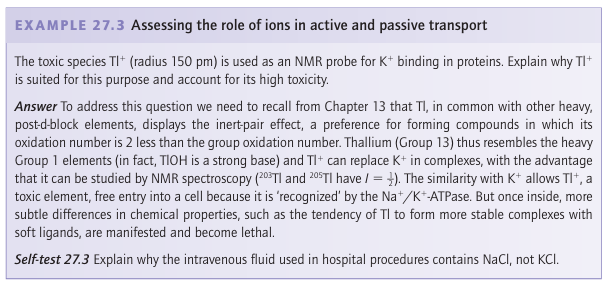 Key points: Transport across a membrane is active (energized) or passive (spontaneous); the flow of ions is achieved by proteins known as ion pumps (active) and channels (passive). In Chapter 11 we saw that differentiating between Na and K, two ions that are very similar except for their radii (Resource section 1), is achieved through their selective complexation by special ligands, such as crown ethers and cryptands, with dimensions ap propriate for coordination to one particular kind of ion. Organisms use this principle in the molecules known as ionophores, which have hydrophobic exteriors that make them soluble in lipids. The antibiotic valinomycin (Section 11.16) is an ionophore that has a high selectivity for K, which is coordinated by six carbonyl groups. It enables K to pass through a bacterial cell membrane and thereby dissipate the electrical potential difference, so causing the bacterium’s death. At the higher end of the complexity scale are the ion channels, which are large mem brane-spanning proteins that allow selective transport of K+ and Na+ (as well as Ca2+ and Cl-) and are responsible for electrical conduction in nervous systems as well as in coupled transport of solutes.4 Figure 27.4 shows the important structural aspects of the potential gated K channel. Moving from the inside surface of the membrane, the enzyme has a pore (which can open and close on receipt of a signal) leading into a central cavity about 1 nm in diameter; up to this stage K ions can remain hydrated. Polypeptide helices pointing at this cavity have their partial charges directed in such a way as to favour population by cations, resulting in a local K concentration of approximately 2 m. Above the central cavity the tunnel contracts into a selectivity filter consisting of helical ladders of closely spaced peptide carbonyl-O donors that form a sequence of four cubic eightfold coordination sites. During operation of the channel these sites are occupied, at any one time, by a queue of two K ions and two H2 O molecules in alternate fashion, as in …K+…H2O…K+…H2O…. The rate of passage of K ions through the selectivity filter is close to the limit for diffusion control. A plausible mechanism for selective K transport (Fig. 27.5) involves concerted displacement of K ions between adjacent cubic carbonyl-O sites through intermediate, unstable octahedral states in which the K ions are coordinated equatorially by four carb onyl-O donors and axially by the two intervening H2O molecules. This mechanism is not