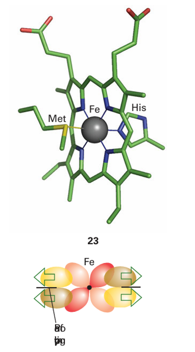 Key points: Cytochromes operate in the potential region 0.3 to 0.4 V; they have a combination of low reorganization energy and extended electron coupling through delocalized orbitals. Cytochromes were identified many years ago as cell pigments (hence the name). They contain an Fe porphyrin group and the term ‘cytochrome’ can refer to both an individual protein and a subunit of a larger enzyme that contains the cofactor. Cytochromes use the Fe3 /Fe2 couple and are generally six-coordinate (23), with two stable axial bonds to amino acid donors, and the Fe is usually low spin in both oxidation states. This contrasts with ligand-binding Fe-porphyrin proteins such as haemoglobin, for which the sixth coordination site is either empty or occupied by an H2O molecule. A good way to consider the capability of cytochromes for fast electron transfer is to treat the d orbitals of Fe (III) and Fe(II) in terms of an octahedral ligand field and to consider the overlap between the electron-rich but nearly nonbonding t2g orbitals (the configurations are t2g5 and t2g 6 in Fe(III) and Fe(II), respectively) and the orbitals of the porphyrin. The electron enters or leaves an orbital having π overlap with the π* antibonding molecular orbital on the ring system. This arrangement provides enhanced electron transfer because the d orbitals of the Fe atom are effectively extended out to the edge of the porphyrin ring, so decreasing the distance over which an electron must transfer between redox partners (Fig. 27.23). The paradigm of cytochromes is mitochondrial cytochrome c (12 kg mol 1, Fig. 27.24). This cytochrome is found in the mitochondrial intramembrane space, where it supplies electrons to cytochrome c oxidase, the enzyme responsible for reducing O2 to H2O at the end of the energy-transducing respiratory chain (Section 27.10). The fifth and sixthlig ands to Fe in cytochrome c are histidine (imidazole-N) and methionine (thioether-S, 23). Methionine is not a common ligand in metalloproteins but because it is a neutral, soft