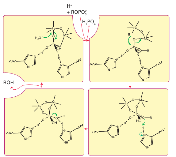 Figure 27.32 Proposed mechanism of action of acid phosphatase. The metal site M(II) is occupied by Fe (most common in animals) or by Mn or Zn (in plants).