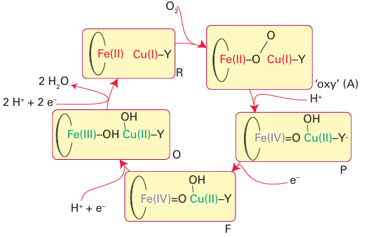 Figure 27.36 The catalytic cycle of cytochrome c oxidase. The intermediates are labelled according to current convention. Electrons are provided from the other haem and CuA. During the cycle, an additional four H are pumped across the membrane.