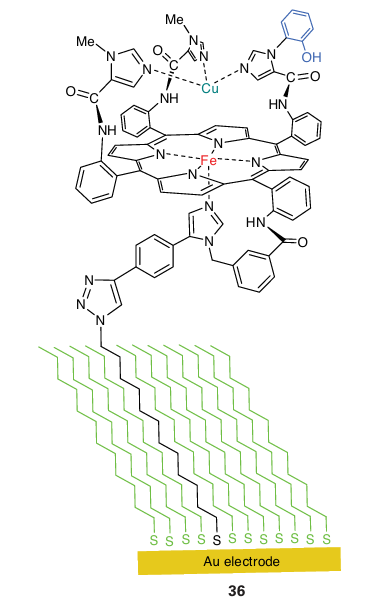 Starting from the state in which the active site is Fe(II) Cu(I), O2 binds to give an intermediate (oxy) that resembles oxymyoglobin. However, unlike oxymyoglobin, this intermediate takes up the other electron that is immediately available, producing a peroxy species that quickly breaks down to give an intermediate known as P. Species P has been trapped and studied by optical and EPR spectroscopy, which show that it contains Fe(IV) and an organic radical that may be located on the unusual His Tyr pair (Y.). The oxido-Fe(IV) (ferryl) group is formed by heterolytic cleavage of O2 , producing a water molecule. The role of a cation radical is again noted: without this radical, the Fe would have to be assigned as Fe(V). It is vital that intermediates such as peroxide are not released during conversion of O2 to water. Studies with an elaborate model complex (36) which can be attached to an electrode show that the presence of the phenol is crucial because it allows all four electrons necessary for the reduction of the O2 to be provided rapidly without relying on long-range electron transfer, which is slow through the long-chain aliphatic linker. If the phenolic OH group is replaced by -OCH3, hydrogen peroxide is released during O2 reduction because the methoxy derivative is unable to form an oxidized radical. The blue Cu oxidases contain a blue Cu centre that removes an electron from a substrate and passes it to a trinuclear Cu site that catalyses the reduction of O2 to H2 O. Two examples, ascorbate oxidase and a larger class known as laccases, are well characterized, whereas another protein, ceruloplasmin, occurs in mammalian tissue and is the least well understood. Ascorbate oxidase occurs in the skins of fruit such as squash. Its role may be twofold: to protect the flesh of the fruit from O2 and to oxidize phenolic substrates to in termediates that will form the skin of the fruit. Laccases are widely distributed, particularly