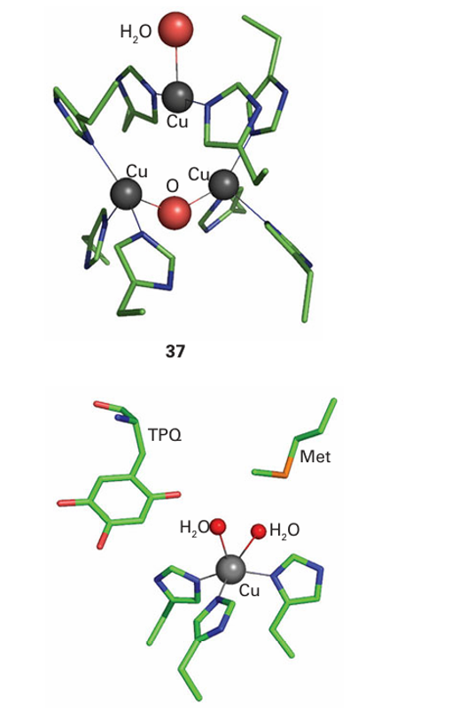 in plants and fungi, from which they are secreted to catalyse the oxidation of phenolic substrates. The active site at which O2 is reduced (37) is well buried. It contains a pair of Cu atoms linked in the oxidized form by a bridging O atom, with a third Cu atom situated very close by, completing an almost triangular arrangement. Amine oxidases catalyse the oxidation of amines to aldehydes by using just a single Cu atom that shuttles between Cu(II) and Cu(I), yet the enzyme carries out a two-electron reduction of O2 , producing a molecule of H2O2 . The problem is overcome because, like cytochrome c peroxidase and cytochrome c oxidase, amine oxidases have an additional oxidizing source located near to the metal, in this case a special cofactor called topaquinone (TPQ), which is formed by post-translational oxidation of tyrosine (38).