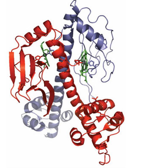 Figure 27.52 The structure of CooA, a bacterial CO sensor and transcription factor. The molecule, a dimer of two identical subunits (represented as red and blue), has two haem-binding domains and two ‘helix turn–helix’ domains that recognize a section of DNA. The protein ligands to the Fe atoms are a histidine from one subunit and an N-terminal proline from the other. The binding of CO and displacement of proline disrupts the assembly and allows CooA to bind to DNA.