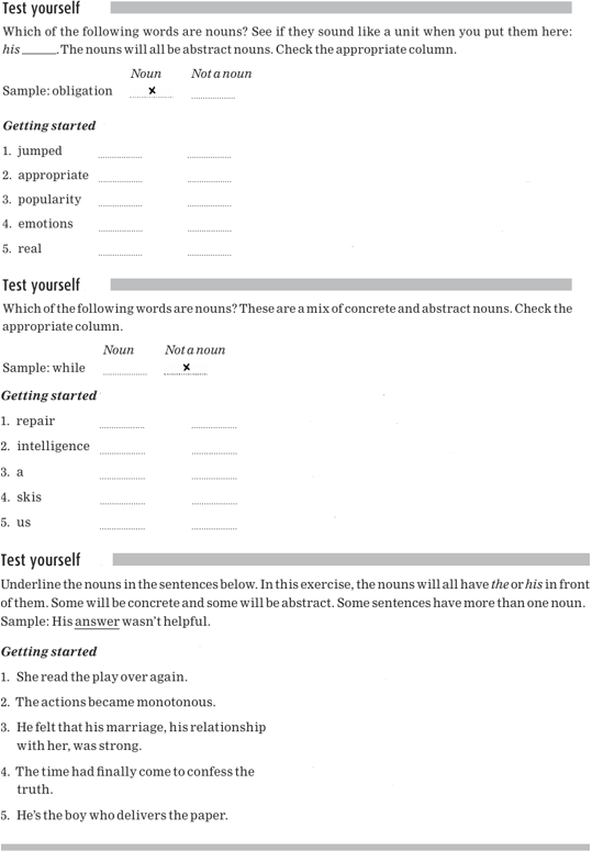 Another easy way to identify a noun, especially an abstract noun, is to put the word his (or other words like it) in front of it and see if it sounds like a unit. For example, his complaint, his happiness, his concern all are units; therefore, complaint, happiness, and concern are nouns.