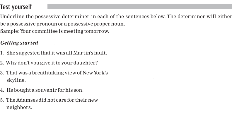 The possessive in sentence 1 is called a possessive pronoun; the possessive in sentence 2 is called a possessive proper noun. Notice that, just like articles and demonstratives, possessive pronouns and possessive proper nouns can appear directly before a noun. We’ll discuss each of these separately.