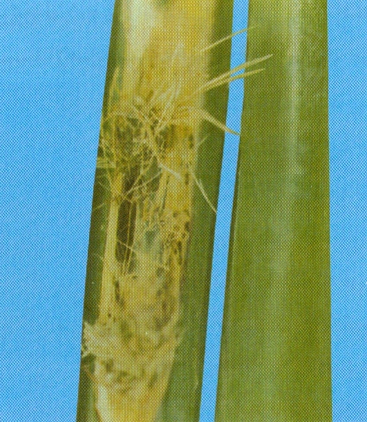 يلاحظ النفق المائل بالجريد الذي يسببه حفار السعف والسائل الحمضي الذي تفرزه النخلة المصابة