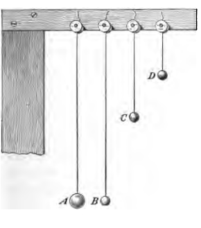 Demonstration. - Suspend side by side four pendulums made by fastening lead balls to the ends of strong threads (Fig. 1). Make two of them 1 m. long, one 50 cm., and one 25 cm. Measure the distance from the point of suspension to the middle of each ball. Vibrate pendulums A and B. Do two pendulums of the same length vibrate in the same time? Vibrate A and B so that one swings about twice as far as the other. Do they still vibrate in the same time? Vibrate B (or A) and C. Does a pendulum half as long as another vibrate in half the time? Vibrate B (or A) and D. What is the relation between the time of vibration of one pendulum and that of another one fourth its length?