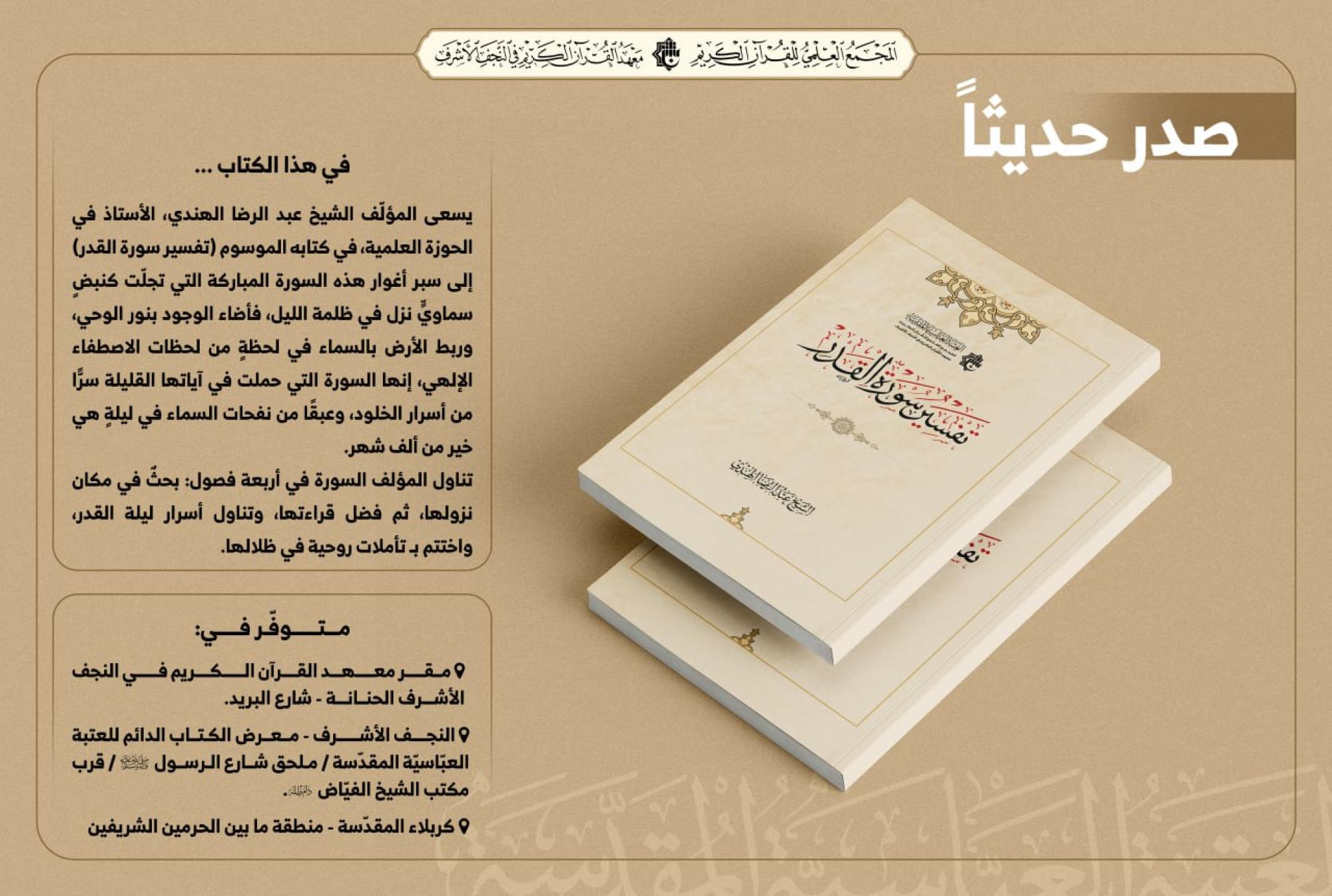 صدر حديثًا عن المجمع العلمي للقرآن الكريم في العتبة العباسية المقدسة كتاب (تفسير سورة القدر) للمؤلف الأستاذ في الحوزة العلمية الشيخ عبد الرضا الهندي. وتولى إصدار الكتاب معهد القرآن الكريم في النجف الأشرف التابع للمجمع. ويسعى المؤلف عبر هذا الكتاب إلى استكشاف عمق سورة القدر، التي تُعد لحظة من لحظات الاصطفاء الإلهي وتحمل في آياتها القليلة أسرار الخلود وعبق نفحات السماء في ليلة هي خير من ألف شهر. وينقسم الكتاب إلى أربعة فصول رئيسة تستعرض بحثًا في مكان نزول السورة، وفضل قراءتها، وأسرار ليلة القدر، وتأملات روحية في ظلالها.