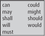 Historically, those modals on the left have been considered present tense forms while those on the right have been considered past tense forms. Note that three of the past tense forms end in the consonant d; think of it as a reminder of the past tense suffix-ed, as in the verb stayed.