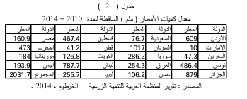 تحدث نتيجة لحركة الرياح على سطح الأرض وتسخين الحرارة للمسطحات المائية ، ثم تحمل الرياح بخار الماء لتسقط الأمطار ، وتتباين كميتها بين الدول العربية ، وهي من أكثر العناصر المناخية تأثيرا على الإنتاج الزراعي وخاصة الزراعة البعلية المطرية وكذلك تربية الثروات الحيوانية اذا ما صاحبتها ارتفاع أو انخفاض في درجة الحرارة فتسبب في ذلك انتشار الامراض والأوبئة التي تصيب الثروة الحيوانية وتقلل من إنتاجها وتناقص اعدادها ، لذا نوضح معدلاتها السنوية الساقطة على الدول العربية للمدة 2010 - 2014 ، كما موضحة في الجدول رقم (2).