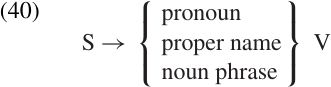 In order to avoid this massive redundancy, we will use the symbol “NP” in all the rules which would otherwise have to refer to a choice between pronoun, proper name, or common noun phrase, as in (43). That is, we will use the term “Noun Phrase” (NP) to refer to any unit which can appear in a “name-like” position in the Phrase Structure, whether it consists of one word or many.1