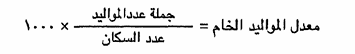 ويكون المعدل في المجتمع الثاني هو 8,8 فى الألف فقط ومعنى ذلك أن المجتمع الأول يتزايد بمعدل أسرع مما يتزايد به المجتمع الثاني - نظريا على الأقل لأن الوفيات هنا لم تحسب بعد - وكمثال واقعى فان جملة سكان مصر في تعداد 1966 بلغت حوالى 7600 0 30 نسمة وبلغ عدد المواليد في تلك السنة حوالی 235000 را مولودا وبذلك يكون معدل المواليد الخام حوالي 41 في الألف في ذلك العام ويصل الى 37 فى الألف في عام 1981 ثم ينخفض إلى 309 في الألف في عام 1990 وينبغي أن نشير إلى أننا نضرب في ألف حتى نقلل من الكسور الى أقصى حد ممكن. وقد يكون معد المواليد الخام Crude birth rate مفيدا في المقارنات السريعة خاصة لدى الجغرافيين ، ولكنه لايفى كثيرا بأغراض البحث في الديموجرافيا وذلك لأنه لا يدخل فى الاعتبار تركيب السكان من حيث النوع والعمر ، وقد يؤثر ذلك - ويفسر أيضا في أسباب انخفاض أو ارتفاع المعدلات ومن أمثلة ذلك أن بعض المجتمعات المهاجرة قد ترتفع فيها نسبة الذكور عن الاناث مما يقلل من معدل المواليد الخام بينما يكون عدد النساء القليل في هذه المجموعة متميزا بارتفاع معدلات الانجاب وكثرة الأطفال ، ومن أجل التغلب على يجرى حساب معدل الانجاب Fertility rate كما يلي: