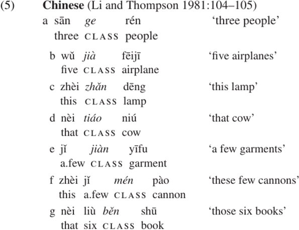 The Chinese noun phrases in (5) show some examples of true classifiers. Li and Thompson (1981) report that classifiers are obligatory when the noun is preceded by a numeral (5a,b), demonstrative (5c,d), or by certain quantifiers including ‘a few,’ ‘a certain,’ ‘every,’ etc. Notice that these classifiers, unlike measure words, are used primarily when the head of the NP is a count noun. Classifiers are not used in Chinese if the NP contains a measure word.