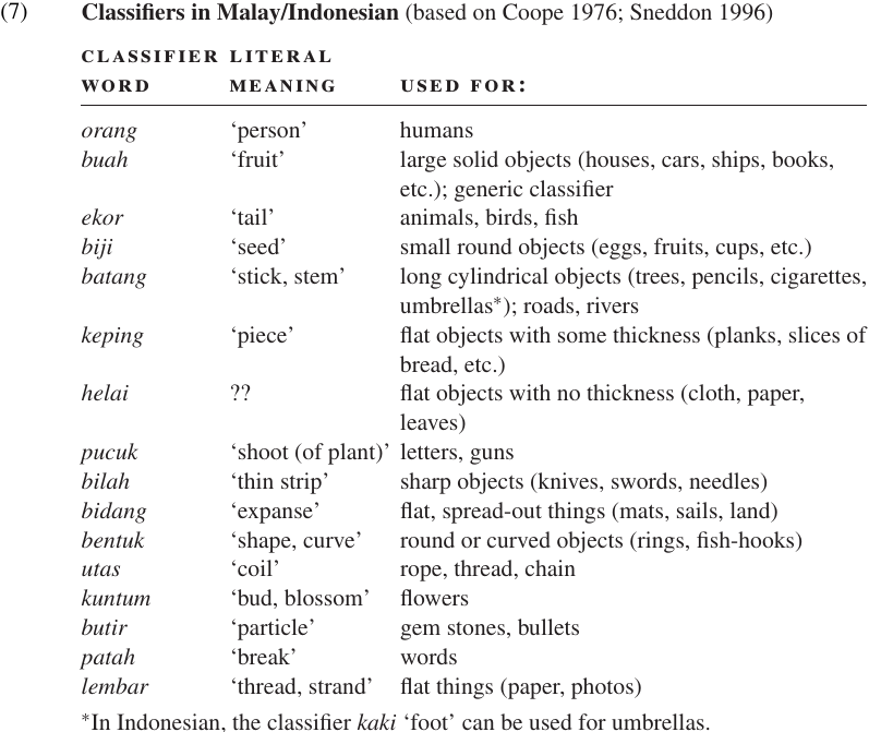 The classifier system of Malay is somewhat similar to that of Chinese. Classifiers must be used with most countable nouns whenever a numeral is present, and also with certain definite quantifiers (e.g. ‘several’). The classifier word, italicized in the following examples, forms a constituent with the numeral or quantifier, and that constituent may occur either before or after the head noun: