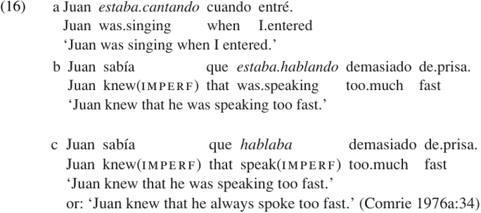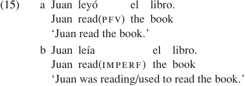 Comrie (1976a) notes that Spanish has a morphological contrast between two past tense forms: the perfective (15a), traditionally referred to as the PRETERIT, and imperfective (15b). Notice that the imperfective form is ambiguous between progressive and habitual senses, as reflected in the English translation.