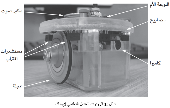 يُوضّح الشكل1 أحد روبوتات إيباك. الحق أنَّ إيباك لا يُعد روبوتا حقيقيًّا، لكنه أيضًا ليس لعبة. إن إي - باك، الذي صممه فرانشيسكو موندادا وزملاؤه في المعهد الفيدرالي للتكنولوجيا في لوزان، سويسرا، لأغراض دراسية وبحثية في مجال الروبوتات المتحركة، هو روبوت صغير متحرك مزود بعجلات؛ ومن ثم فهو مرشح جيد لنا للنظر إلى روبوت من الداخل. ويُعد إيباك أيضًا روبوتا مفتوح المصدر؛ مما يعني أن جميع . خططه وبرامجه