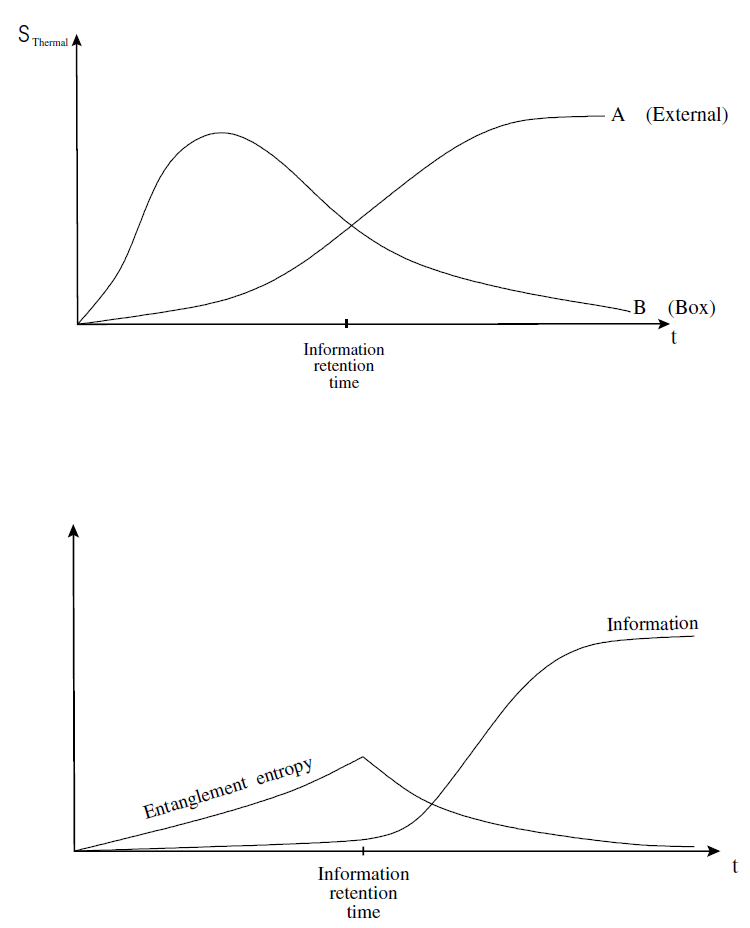 Fig. 1.1. Top: evolution of the thermal entropies of box and exterior. Bottom evolution of entanglement entropy and information.