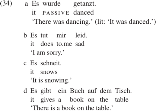 Notice that the English translations of the examples in (19), (32), and (33) all contain a DUMMY subject, it or there. A dummy is an element which has no semantic content but simply occupies the subject position. Dummies often have the form of a pronoun, but they do not actually refer to anything. Some German examples of impersonal constructions containing the dummy subject es ‘it’ are given below. Example (34c) is a typical meteorological clause, while (34d) is an indefinite existential.
