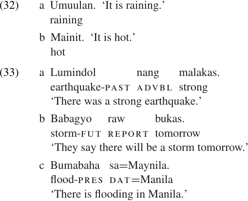 Impersonal constructions are frequently used for METEOROLOGICAL clauses like the Tagalog examples in (32–33). The predicates in such clauses are sometimes called “weather verbs,” but they need not be verbs at all. The clauses in (32a) and (33a–c) all have verbal predicates, as indicated by their morphological structure, but the predicate in (32b) is an adjective.