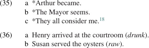 One very important piece of evidence is the fact that predicate complements are often obligatory; compare the examples in (35) with those in (8). Adjuncts are never obligatory, as illustrated by the examples of DEPICTIVE predicate adjuncts in (36). Thus, the fact that the predicate phrases in (7–8) are obligatory provides evidence that they are complements.