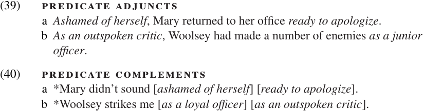 Bresnan (2001:267ff.) presents several other kinds of evidence demonstrating the difference between predicate complements and predicate adjuncts. We will mention two of these briefly. First, adjuncts can often occur in a variety of positions within the sentence, as illustrated in (37); but the position of predicate complements is relatively fixed, as illustrated in (38).