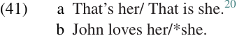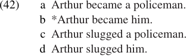 Well, then, how do we know that these complement phrases are not, in fact, grammatical objects? At least in the case of post-verbal NPs like those in (7b) and (8a), this might seem like a reasonable hypothesis. (Of course, the fact that APs can occur as predicate complements is itself an important piece of evidence, since an object cannot normally be an AP.) In some languages, e.g. Latin, there is evidence from case marking: direct objects take accusative case, while predicate complement NPs and APs agree with the case marking of the subject (normally nominative).19 Even in English, where case is marked only on personal pronouns, there is a weak difference in case-marking potential between objects and predicate complements, as shown in (41).